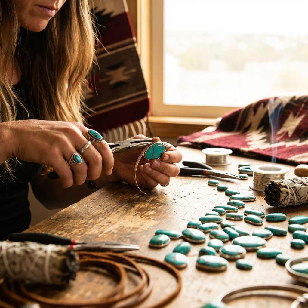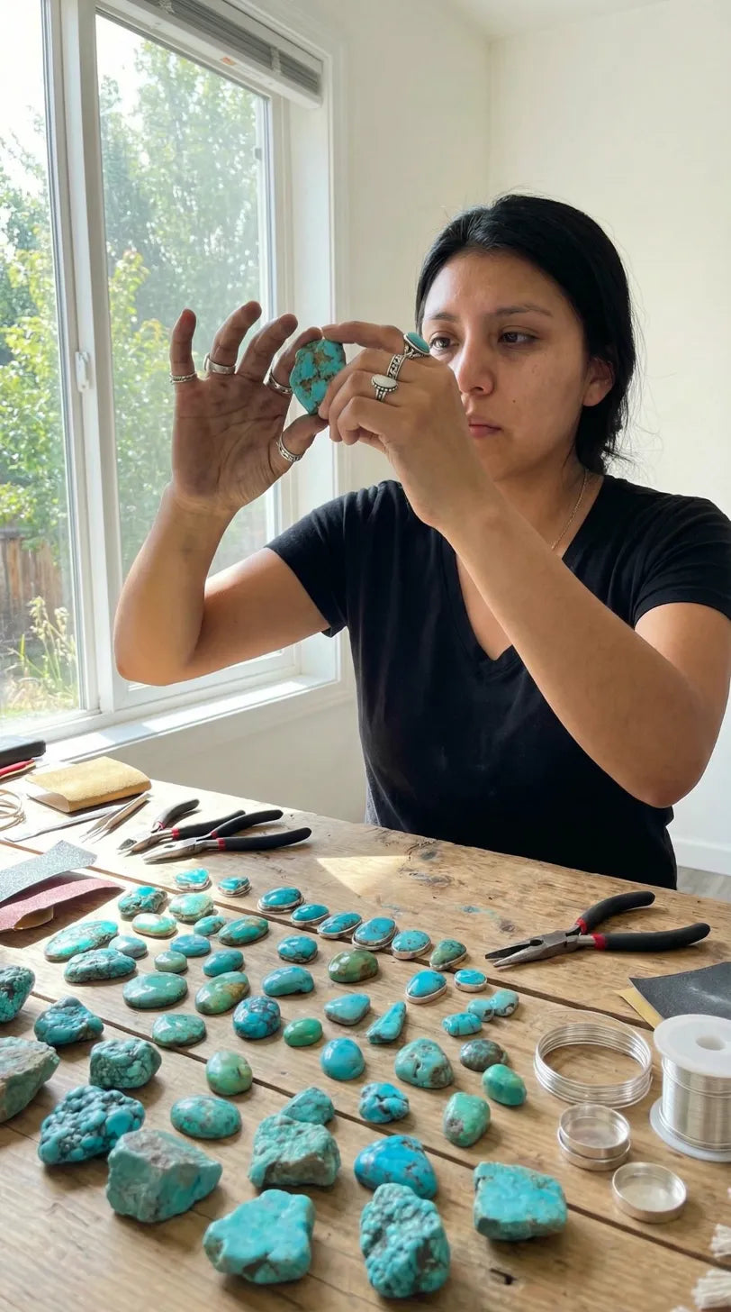 Every piece in our collection is handcrafted by a Native artisan from her home on the reservation. She learned this craft from her grandmother, who learned it from hers. She works with turquoise sourced from the same land her family has walked for generations — choosing each stone by hand, shaping every setting with prayer and purpose. When you wear Stone & Spirit, you carry a piece of that lineage with you.